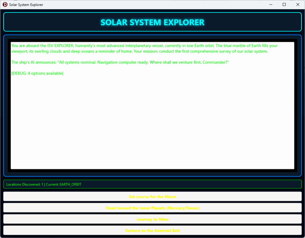 This week I gave a presentation, demo and participated in Live Q&A at the Embarcadero CodeRage 2025 online developer conference. My session showed how to use AI tools including ChatGPT v5, Claude Sonnet v4.5, Gemini v3 to build the project and code for a Multi-Device Solar System Text Adventure game using Embarcadero Delphi 13 and the FireMonkey (FMX) cross platform framework. Using FireMonkey allows you to create applications for Windows, macOS, iOS, Android and Linux using the same project code.